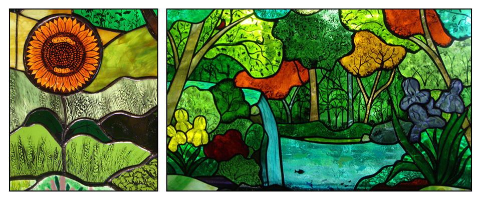 Cost is determined by size, details, and type of glass, approximately $500. a square foot or more with fine details, lots of painting, fusing and/or premium glass. A design deposit is required, but is applied to the total cost. A second deposit of at least 25% is collected when all details are finalized. Scheduling is determined based on previous commitments.